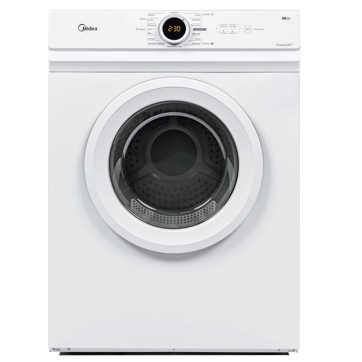 La secadora Midea tiene un diseño innovador y elegante que facilita su uso y mejora su experiencia. Con el Display Lunar, puede ver todos los programas y opciones en un solo lugar. Con el programa Hygiene Dry, puede esterilizar su ropa después del secado, manteniendo el tambor a alta temperatura durante más de 30 minutos. Con el programa Refrescar, puede eliminar los olores no deseados de su ropa, como el de la cocina, el moho o el cigarro. Con la función Anti Arrugas, puede evitar que su ropa se arrugue si se le olvida sacarla del tambor, ya que este se gira cada 10 minutos durante 2 horas. Con el programa Secado Rápido, puede secar cargas pequeñas en menos de 40 minutos cuando tenga prisa. Y con la ventilación fuerte, puede asegurarse de que su ropa quede seca y fresca en cada ciclo.